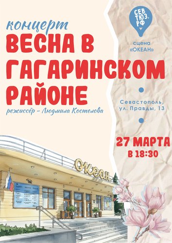 27 марта, во Всемирный день театра, на сцене «Океан» состоится премьера музыкального концерта «Весна в Гагаринском районе». Постановка заслуженной артистки города Севастополя Людмилы Костеловой обещает стать настоящим подарком для всех жителей и гостей города, ценящих душевные мелодии и атмосферу родного дома.
