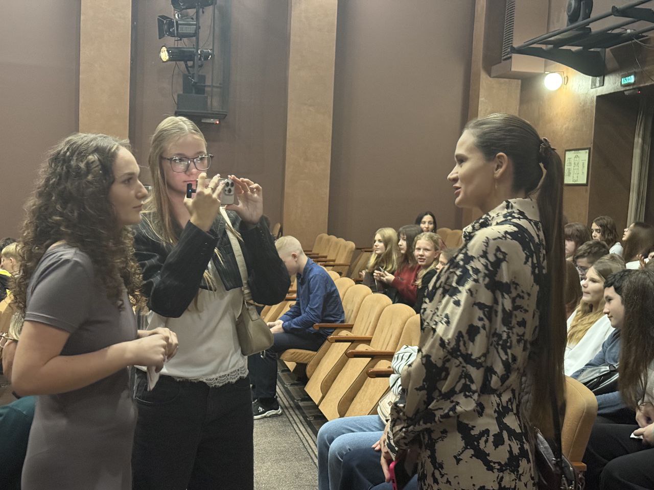 Первое выездное занятие состоялось после спектакля «Недоросль». Гимназисты не просто посмотрели классическую комедию, а сразу погрузились в профессию, взяв в руки микрофоны для общения с артистами. Их первыми героями стали заслуженная артистка города Севастополя Елена Воронцова и актер Егор Филипенко.